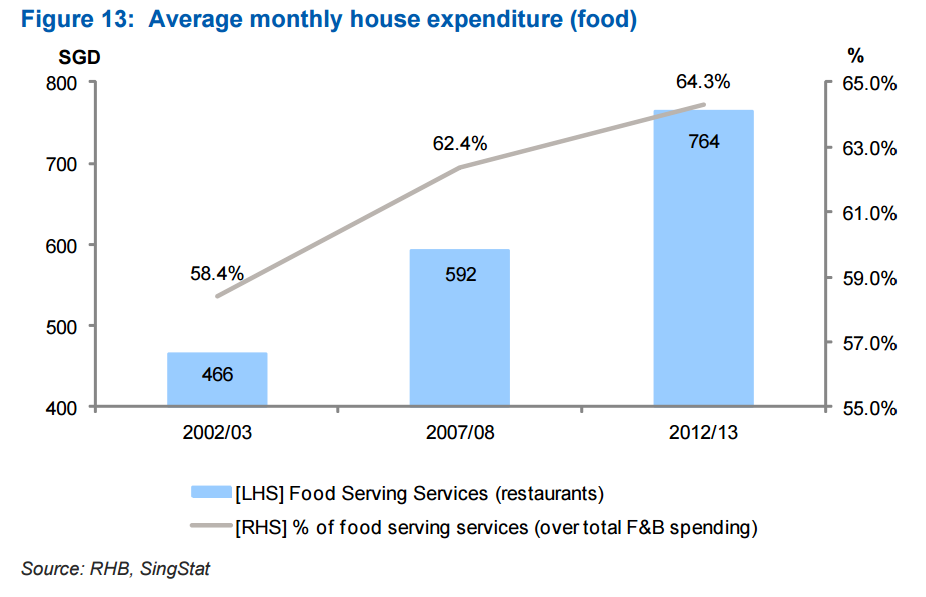 This chart from RHB Research shows that households spent an average of $764 per month on dining out in 2012/13, almost double from $466 per month in 2002/03.